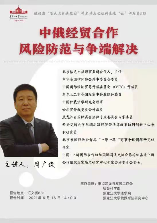 汇文楼835室举行。此次讲座的主讲人是北京信达立律师事务所合伙人、主任周广俊律师,主题为“中俄经贸合作风险防范与争端解决”。讲座由黑大亚洲色情