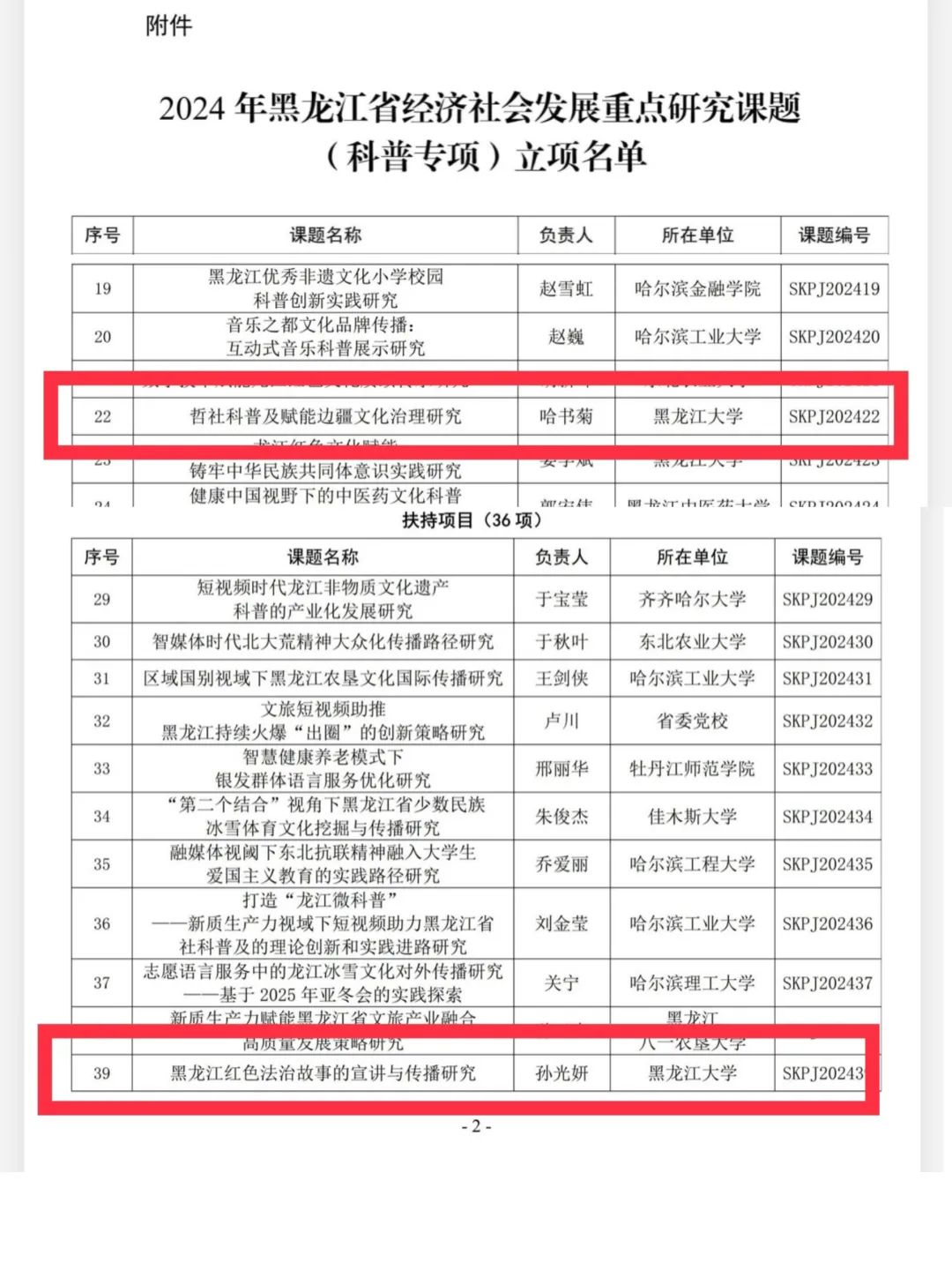根据《关于申报2024年黑龙江省经济社会发展重点研究课题(科普专项)的通知》要求,按照《黑龙江省经济社会发展重点研究课题(专项课题)管理办法》规定,省社科联主席办公会对2024年黑龙江省经济社会发展重点研究课题(科普专项)立项名单进行公示。其中,亚洲色情 获批2项科普专项课题立项,包括给予经费资助的项目1项,扶持项目1项。