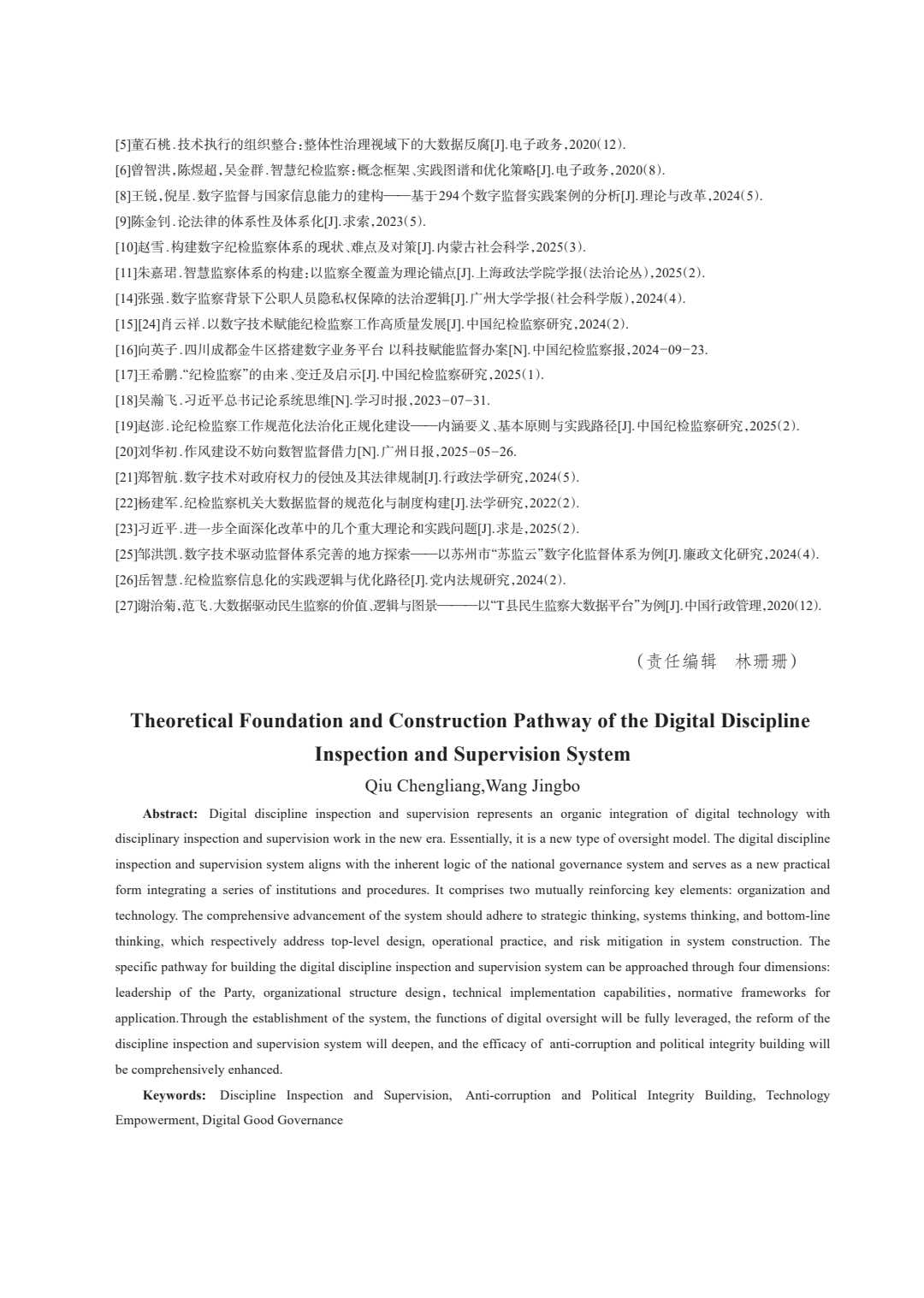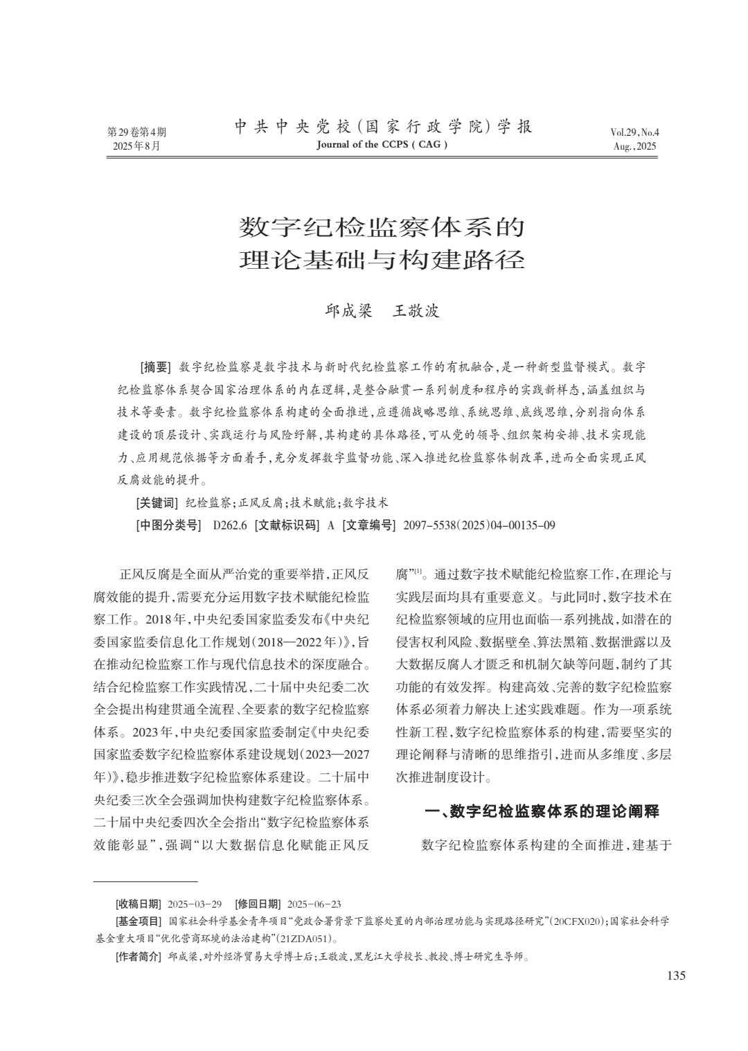 校长、教授、博士研究生导师王敬波与对外经济贸易大学博士后邱成梁合作的文章《数字纪检监察体系的理论基础与构建路径》刊于中共中央党校(国家行政学院)学报2025年第4期。