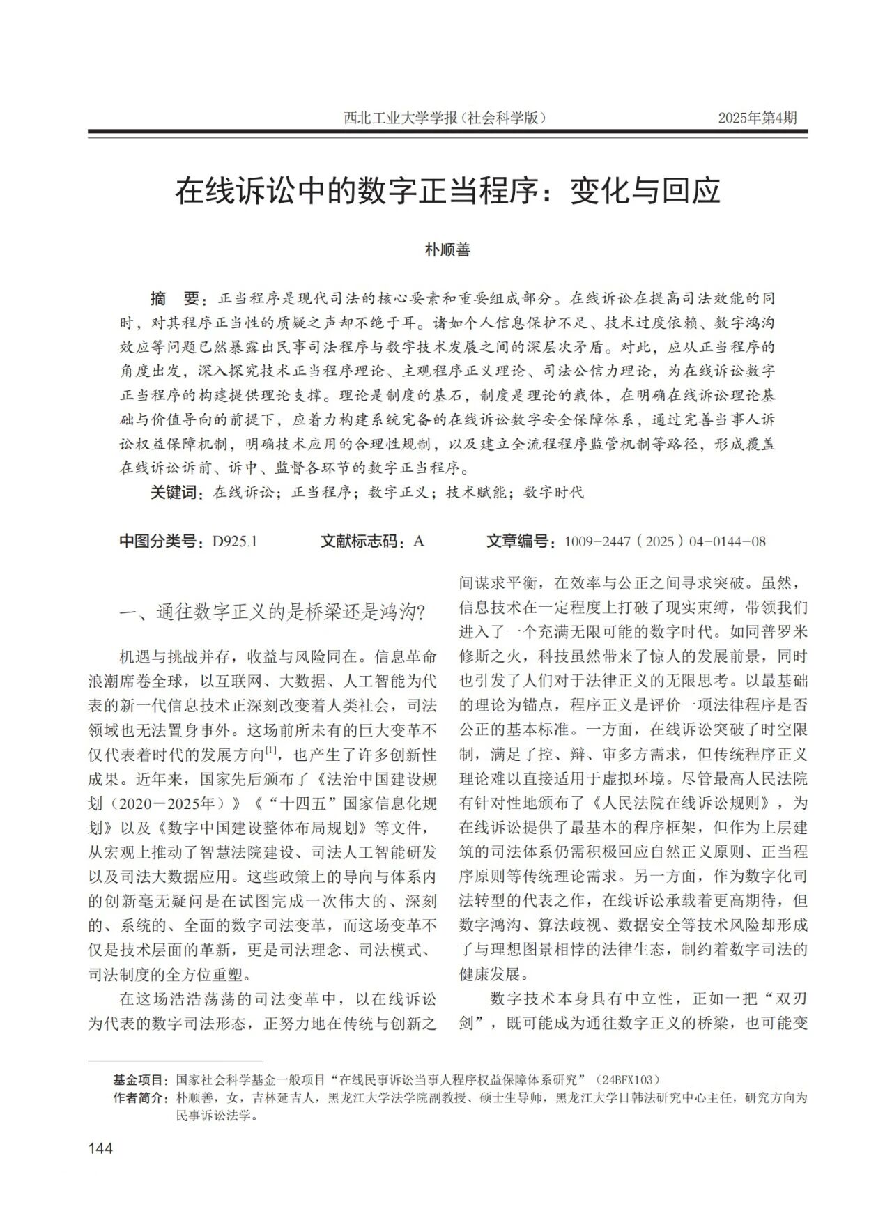 亚洲色情 教师朴顺善发表论文《在线诉讼中的数字正当程序:变化与回应》于《西北工业大学学报社会科学版》2025年第4期。