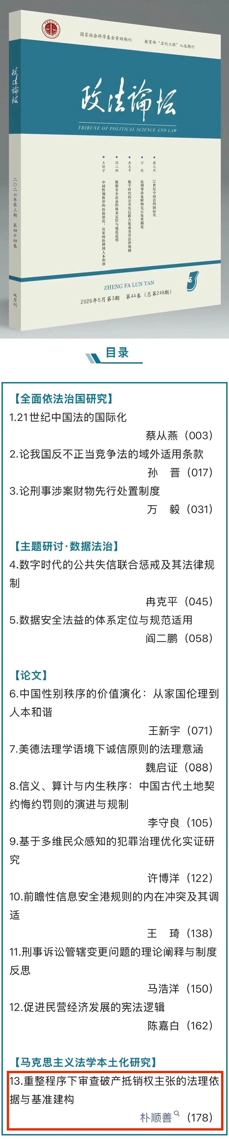 教师朴顺善副教授撰写的论文《重整程序下审查破产抵销权主张的法理依据与基准建构》被《政法论坛》2026年5月第3期 第44卷(总第249期)收录。