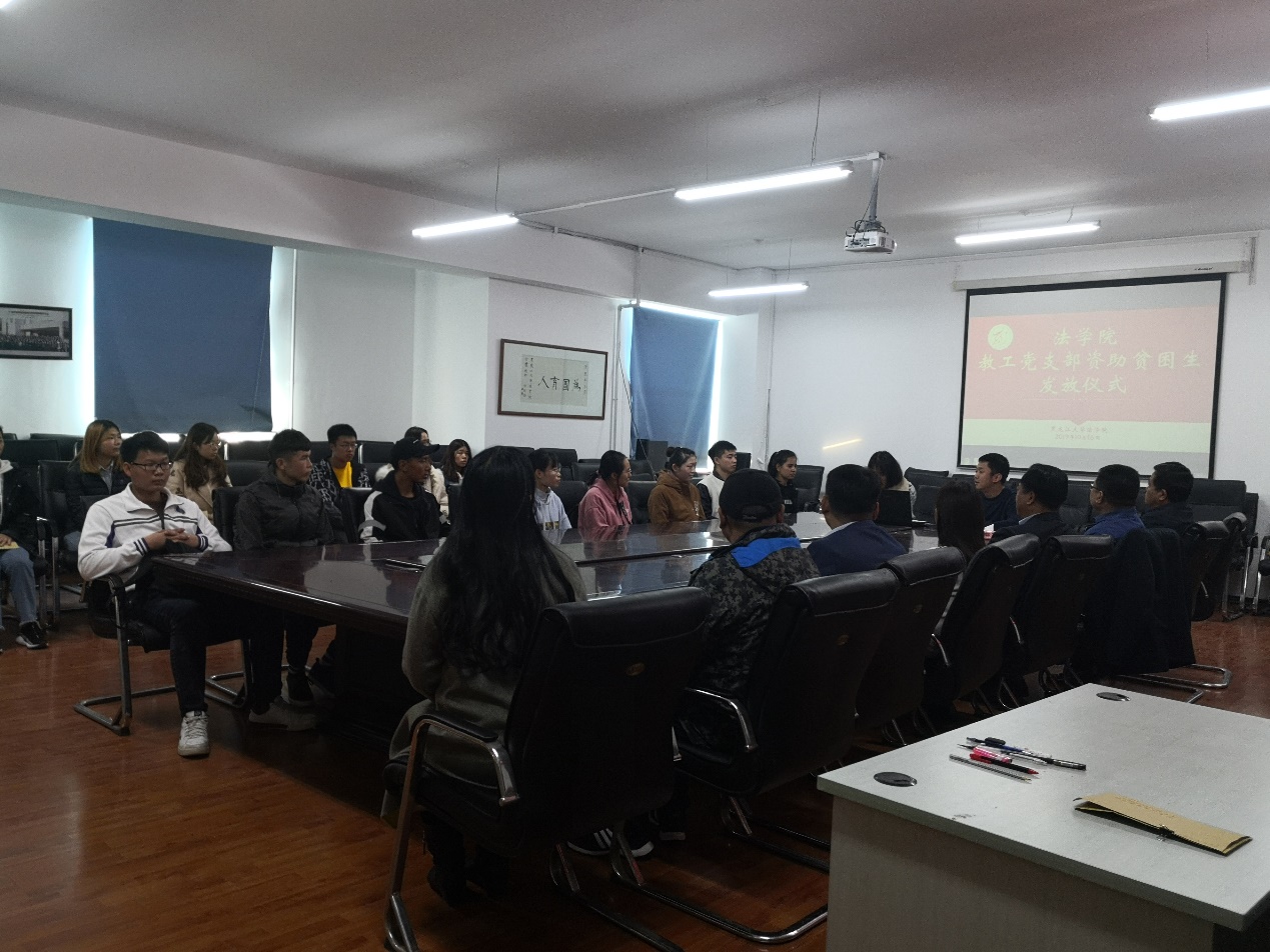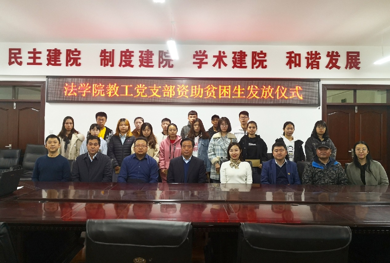 仪式上,教工第一党支部书记杨振宏老师、教工第二党支部书记曲志勇老师先后发言,希望获得资助的同学发奋读书、刻苦学习、常怀感恩之心、常思报效之情、努力成才。随后受助学生代表、2018级刘芳明同学进行发言,她代表全体受助同学对老师们的爱心资助表示感谢,表示一定会把这份感动与温暖化作发奋学习、刻苦钻研的动力,努力成为德法兼修的法学骄子。最后杨振宏老师、曲志勇老师为受助学生发放资助金。