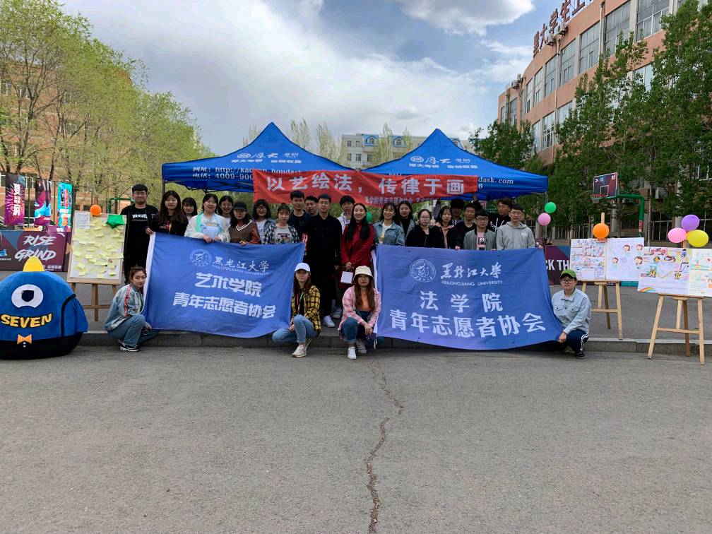 青年志愿者协会与艺术学院青年志愿者协会于5月6日在B区篮球场举办“以艺绘法,传律于画”联合外展。