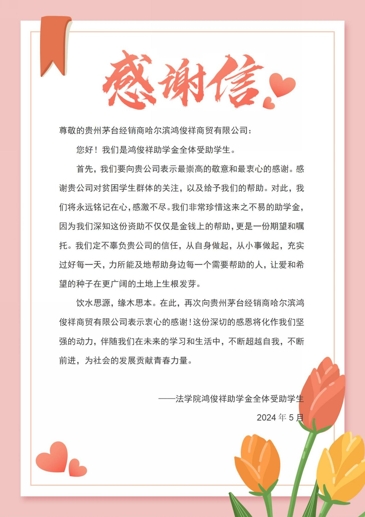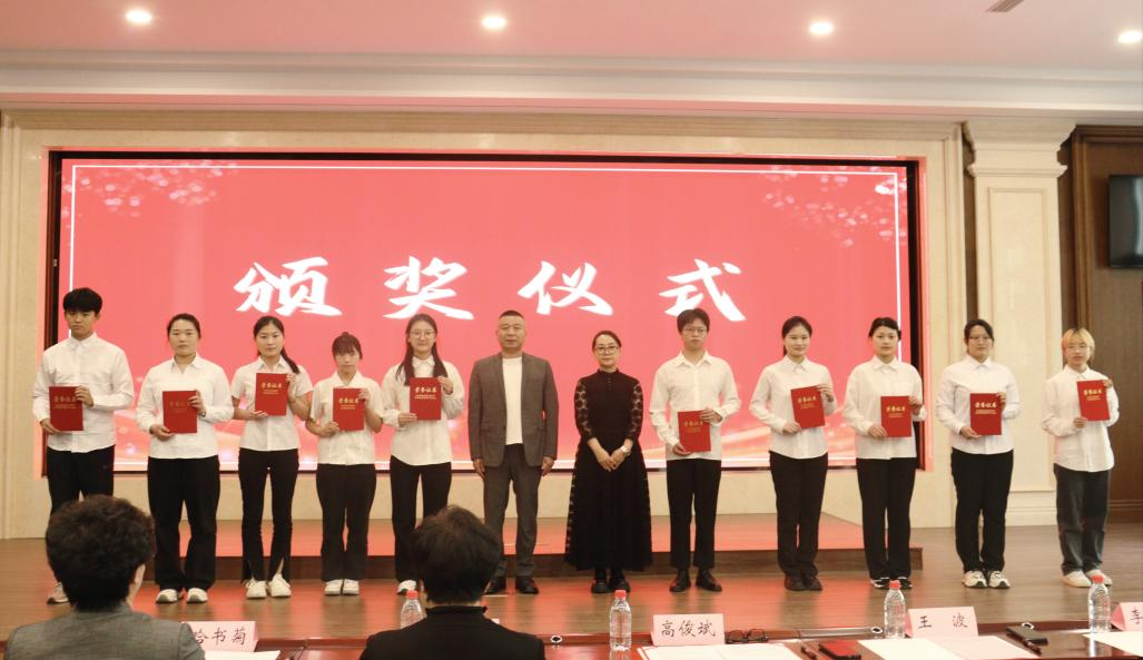 校友服务中心主任杨宇宣读了获助学生名单,贵州茅台经销商哈尔滨鸿俊祥商贸有限公司董事长高俊斌、总经理王波为获得“鸿俊祥助学金”的10名学生颁奖。