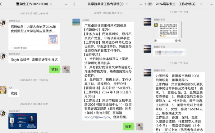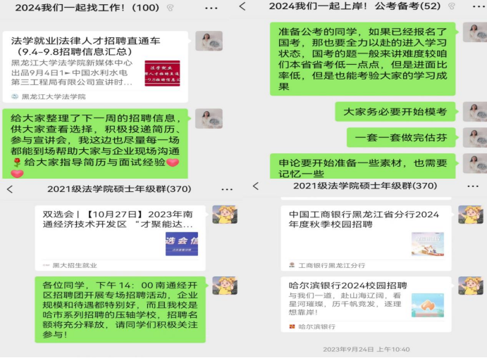 一是召开多层次就业宣讲。召开就业动员宣讲会、就业工作推进会、家长会等就业宣讲20余场,为2024届毕业生分析当前就业形势,积极引导其转变就业观念和就业方式。二是开展立体化培训。根据不同学生群体的就业意向,搭建多渠道平台开展针对性培训,邀请校友、律师、公考讲师开展系列讲座,努力做到精准服务、有效培训、全方位提升。三是进行多角度就业宣传。及时推送各类就业信息与就业政策,依托学院公众号推出法律人才招聘直通车5期,就业先锋系列推送6期,求职贴士等,营造良好就业氛围。
