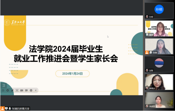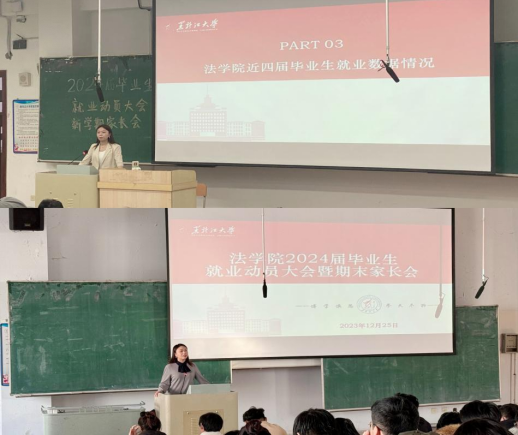 党委副书记董捷,毕业年级辅导员张婧、季禹含、李帅仪,2024届非定向博士、硕士研究生、本科生及家长参加,会议由本科生毕业年级辅导员张婧主持。会上,三位辅导员分别围绕毕业生就业动态数据、黑龙江省事业单位联考的相关政策、博士生就业现状以及趋势进行了详细讲解,董捷副书记进行了总结发言。
