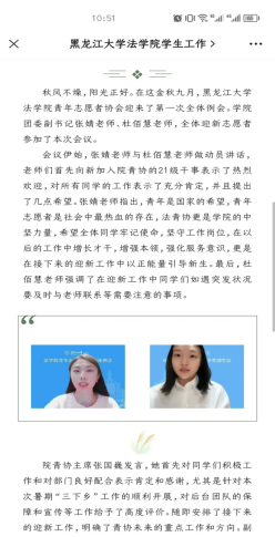 会议伊始,张婧老师与杜佰慧老师做动员讲话,老师们首先向新加入院青协的21级干事表示了热烈欢迎,对所有同学的工作表示了充分肯定,并且提出了几点希望。张婧老师指出,青年是国家的希望,青年志愿者是社会中最热血的存在,法青协更是学院的中坚力量,希望全体同学牢记使命,坚守工作岗位,在以后的工作中增长才干,增强本领,强化服务意识。最后,杜佰慧老师强调了在迎新工作中同学们如遇突发状况要及时与老师联系等需要注意的事项。