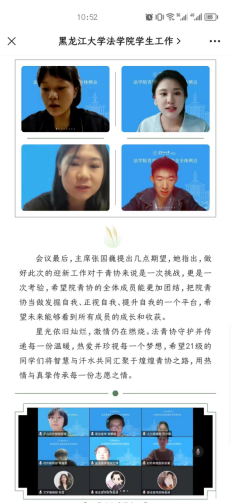 随后,院青协主席张国巍发言,她首先对同学们积极工作和对部门良好配合表示肯定和感谢,尤其是针对本次暑期“三下乡”工作的顺利开展,对后台团队的保障和宣传等工作给予了高度评价。随即安排了接下来的迎新工作,明确了青协未来的重点工作和方向。副主席孙钰、姜祥瑞、田伟分别发言,对青协相关部门以及日常工作做了简要介绍,并且表示十分期待与大家的线下见面。