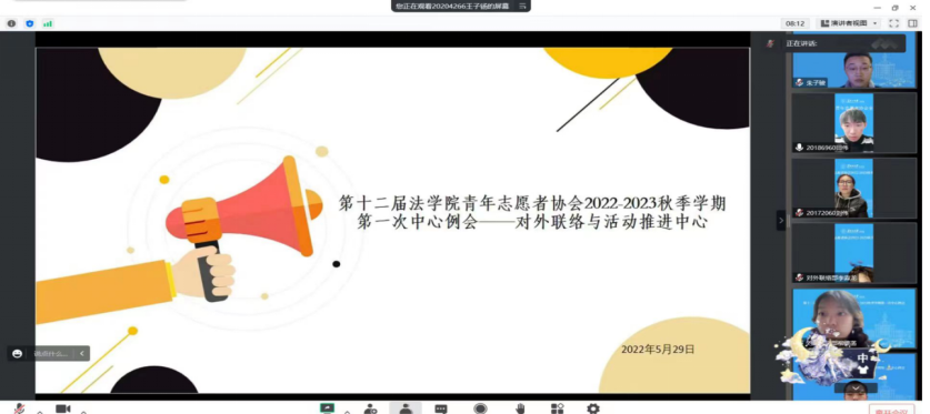 青年志愿者协会开展了2022-2023春季学期第一次中心例会。此次例会在腾讯会议开展,在主席张国巍做了会议开始的发言后,各中心进入各自腾讯会议室开展各中心会议。