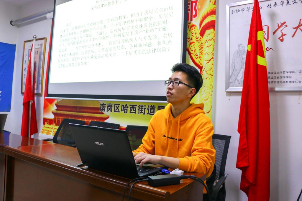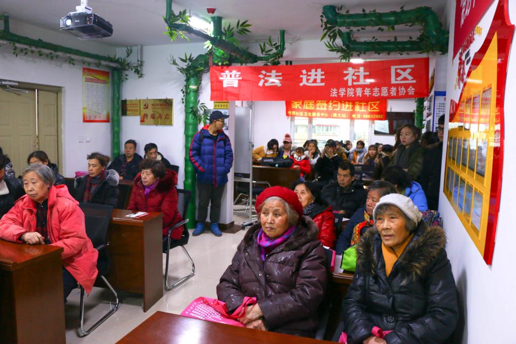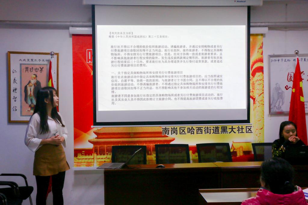 青年志愿者协会于11月20日深入黑大社区开展了普法宣传活动,并以十九大精神为引领,在社区普法教育活动中积极为居民解答社会生活中面临的法律问题,本次活动由志愿者陈金金同学、孙兆铭同学担任宣讲人。