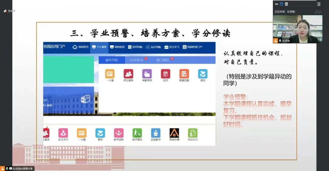 会上,毕业年级辅导员杜佰慧首先就近期全国硕士研究生招生考试、国家公务员考试以及内蒙古自治区2025年度政法专项选调应届优秀大学生毕业生考试的报名时间、报名流程、报名要求等方面进行介绍。同时,对于各类考试报名情况和录取比例进行分析,提醒同学们脚踏实地,科学备考。接着,杜佰慧老师就各类学分修读情况对毕业生们进行提示,着重提醒学业预警的学生,要认真完成本学期课程,提早复习,合理规划好时间,争取全员顺利毕业。