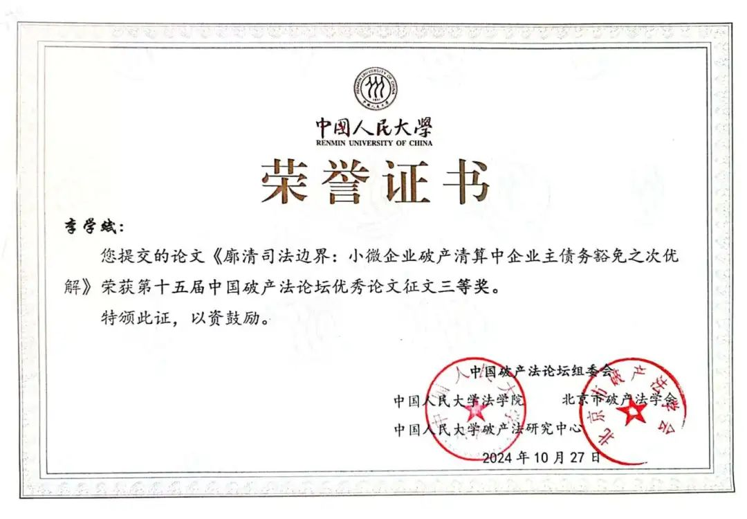 2023级经济法学博士研究生李学斌受邀赴京参加本次论坛。中国破产法论坛组委会对本届论坛征集到的1300余篇会议论文进行了汇编整理和遴选,并在论坛中宣布获奖名单,李学斌撰写的《廓清司法边界:小微企业破产清算中企业主债务豁免之次优解》荣获三等奖。