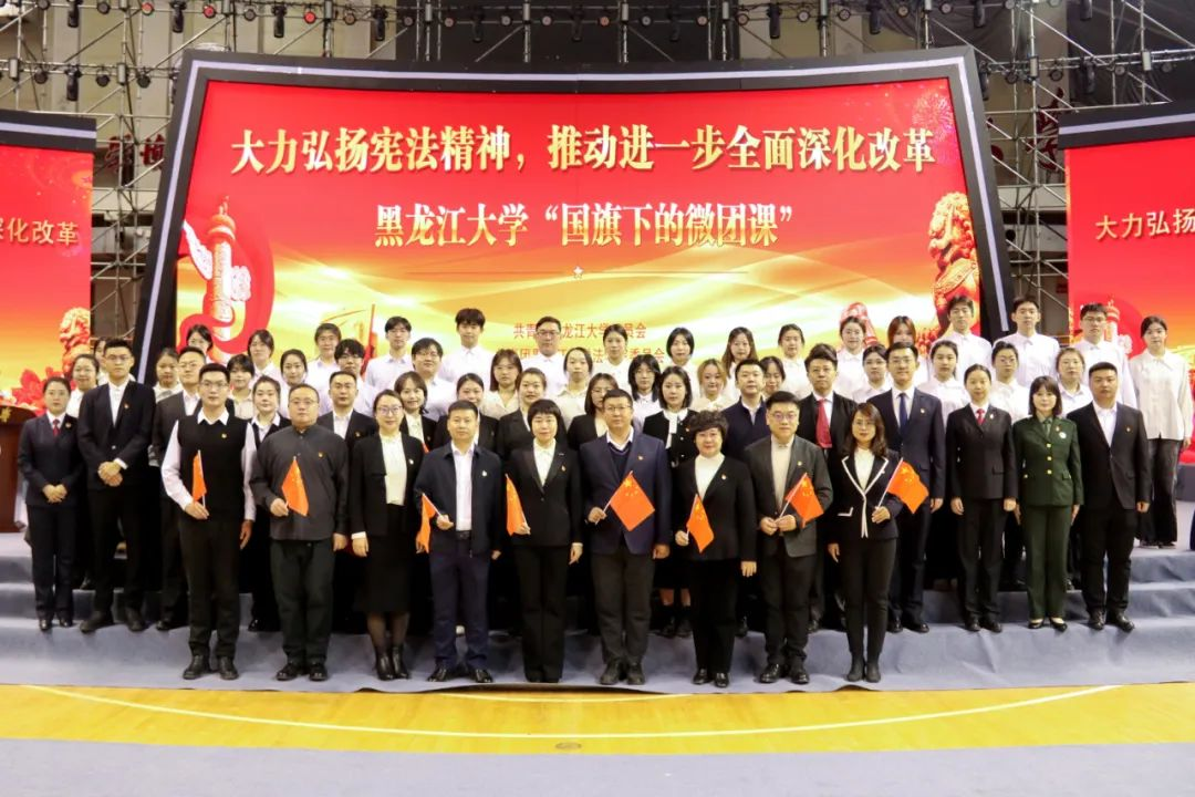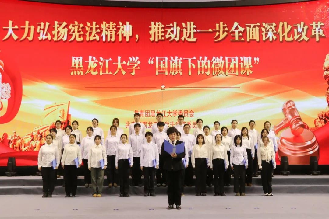 随后,优秀毕业生代表和在校生代表进行诗朗诵《以吾辈之青春,弘扬宪法精神》,坚定的声音在体育馆内久久回荡,仿佛是向广大青年学生发出的时代号召,激励着学子们追逐宪法的光辉,努力成为新时代优秀的黑大学子。最后,全体师生代表合唱校歌《岁月如歌》,师生们满怀深情,歌声悠扬婉转,激励广大青年坚定理想信念,筑牢信仰之基,不忘初心、牢记使命,在宪法精神的引领下,立志成为新时代的奋进者与开拓者,为祖国的繁荣发展贡献力量。