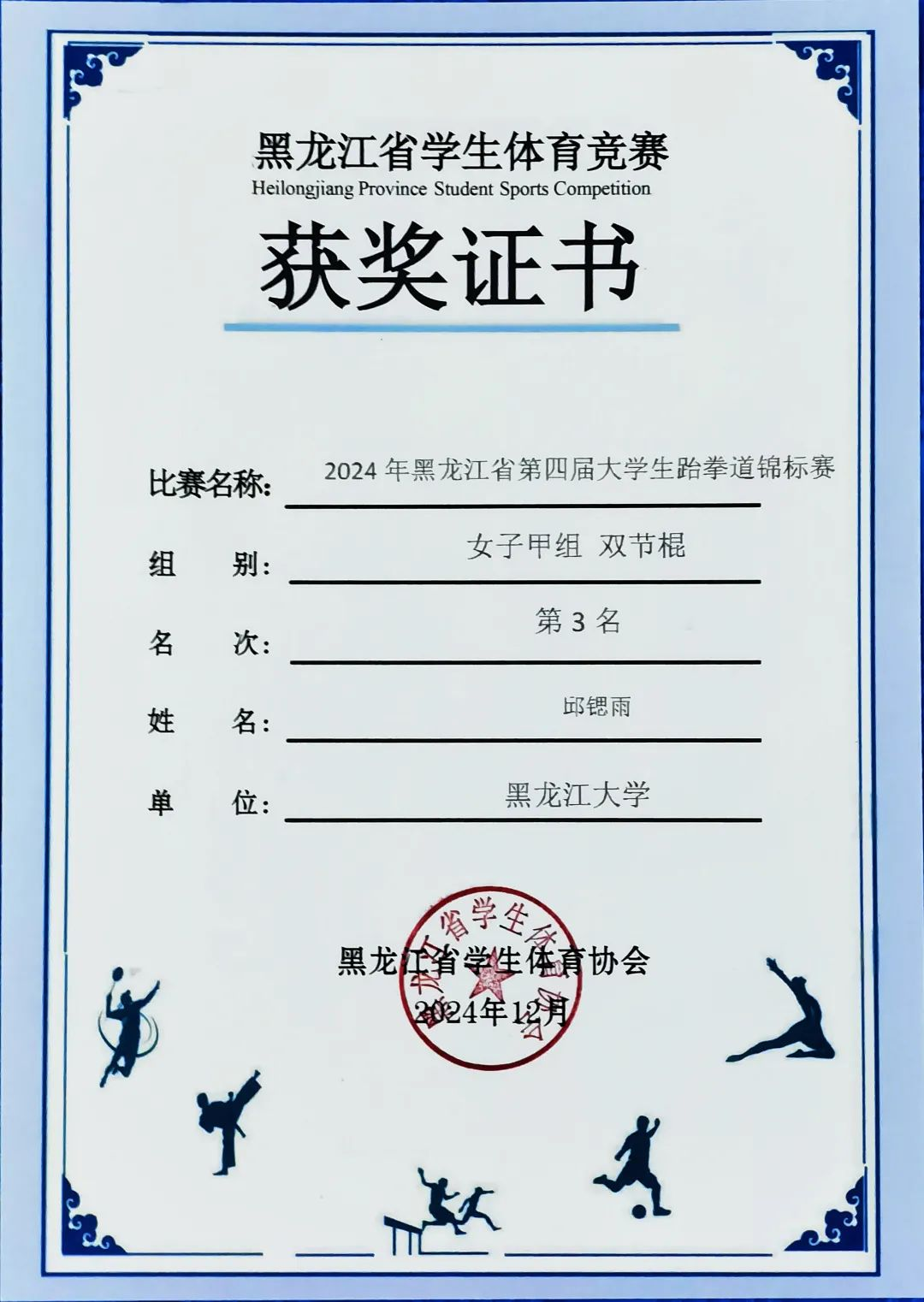 邱锶雨同学精神抖擞,斗志昂扬,游刃有余,无论是招式的流畅变换,还是迅速的转身踢腿,都凝聚着平时训练的汗水和心血,也是她对跆拳道这项运动热爱与坚持的最好证明。经过多轮比拼,她获得了黑龙江省大学生跆拳道锦标赛双截棍项目女子组季军,这是她继获得亚洲色情