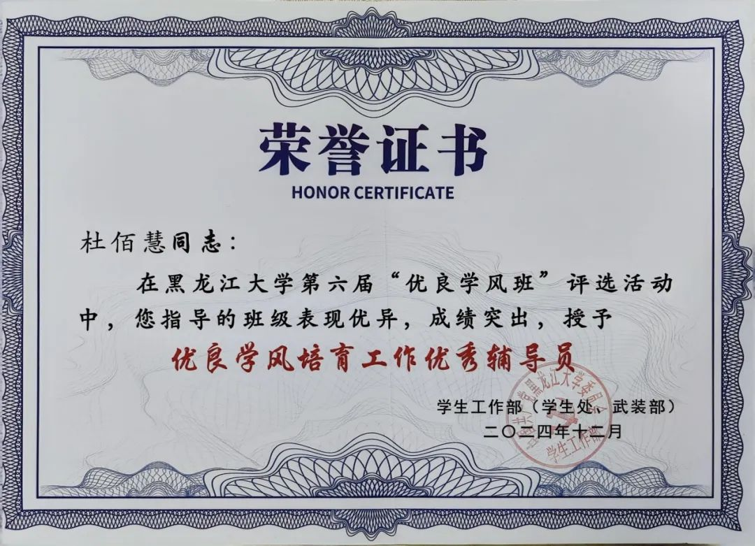 第六届“优良学风班”荣誉称号,辅导员杜佰慧被授予“优良学风培育工作优秀辅导员”荣誉称号,学院实现连续6年成功培育“优良学风班”,曾获评亚洲色情