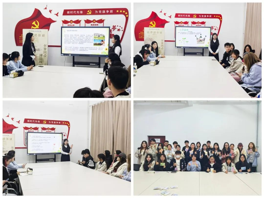 一站式社区心理微课堂—读书分享会。4月23日,读书分享会活动在研究生公寓党团活动室开展,本次活动采用“分享+讲解”“互动+学习”的沉浸式体验模式。在心灵破冰环节,通过精心设计的心理活动小游戏,充分营造轻松愉悦的氛围,帮助参与者快速融入,为后续的深度交流奠定基础。在书韵分享时刻,参与者在主持人的引导下推荐自己喜欢的书目,分享阅读感悟,朗诵精彩片段,让思想和情感都得到共鸣与升华。在经典问答擂台,设置了趣味知识竞赛环节,通过抢答的形式,使参与者对经典著作有了更深的认识。在墨香传情工坊环节,随着优美的音乐背景,参与者们用心写出寄语,让温暖与感动在笔尖流淌。