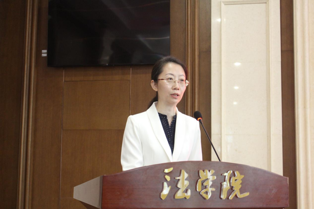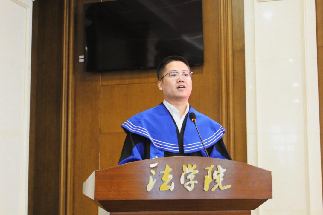 教师代表王佳慧老师发言。她嘱托毕业生们筑牢事业基石,坚持法治信仰和公平正义,在生活中坚守法治理念,秉持法律人的初心与担当,提升人生智慧,找到专业与生活的融合之道。