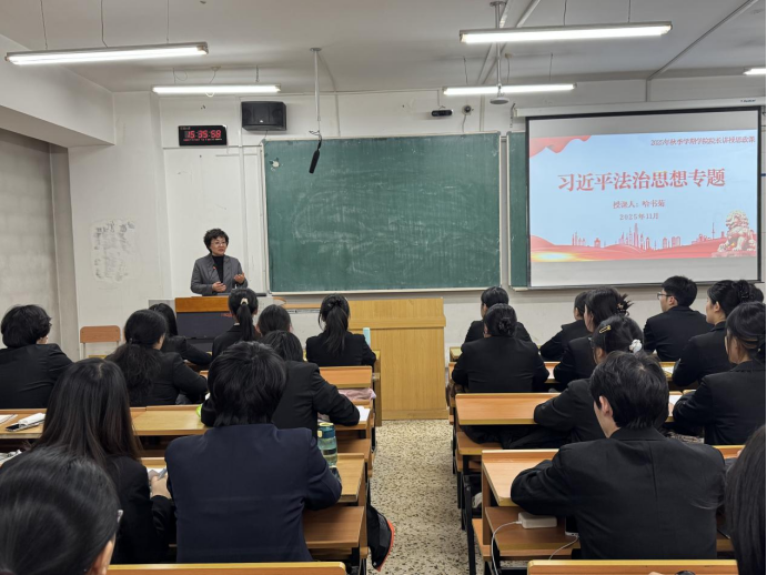 党委书记孙世萍、院长哈书菊分别走进2024级、2022级本科生课堂围绕《决胜“十四五”,开启青春新征程》《习近平法治思想专题》讲授思想政治专题理论课。