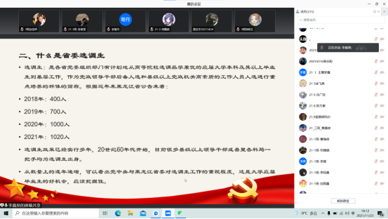 李嘉昊结合自身经历,对黑龙江省委选调生报考及相关情况进行介绍。首先,李嘉昊学长分享了自己的大学感悟。分别从学习方面、学生工作方面、恋爱方面细心认真地为学生们讲述,带给学生提供启示和思考。其次,李嘉昊介绍了什么是省委选调生。分别从选调生这项政策、考试方面、选调生一般负责的工作和乡镇政府的办公环境进行了讲述。让学生们对于选调生这项工作有了一个更加清晰的认识和了解。最后,李嘉昊鼓励学生们努力学习,不负韶华。