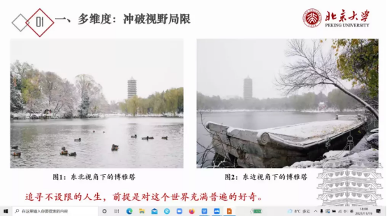 第二部分:不设限,超越既定的边界。张琨以北大不同季节的博雅塔为例,指明作为大学生不要为自己的人生设置限制,在大学生活中应该改变高中的学习模式,在课业学习的另一角度思考学习的内容。在分析问题时,不仅要多维度思考,还要在某一维度下对问题进行扩大和区分,综合多维度和不设限可以作出更适合自己的选择。同时张琨以运动作为类比,将运动与大学生活进行结合,以清华女博士龙明珠毕业选择去中学当老师为例,具体解释了如何做出不设限的选择。