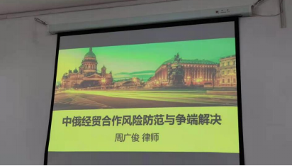 周律师的讲座从俄罗斯联邦法律体系简介、俄罗斯的投资优惠措施和外资准入限制、投资俄罗斯的法律实务问题、中俄贸易中的法律风险防范、俄罗斯破产法对投资人法律风险的影响、经济制裁背景下企业赴俄投资应注意的问题等六个方面展开。
