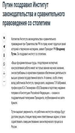 祝贺俄罗斯联邦政府直辖立法比较法研究院建院100周年的祝贺视频。