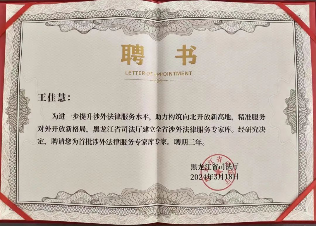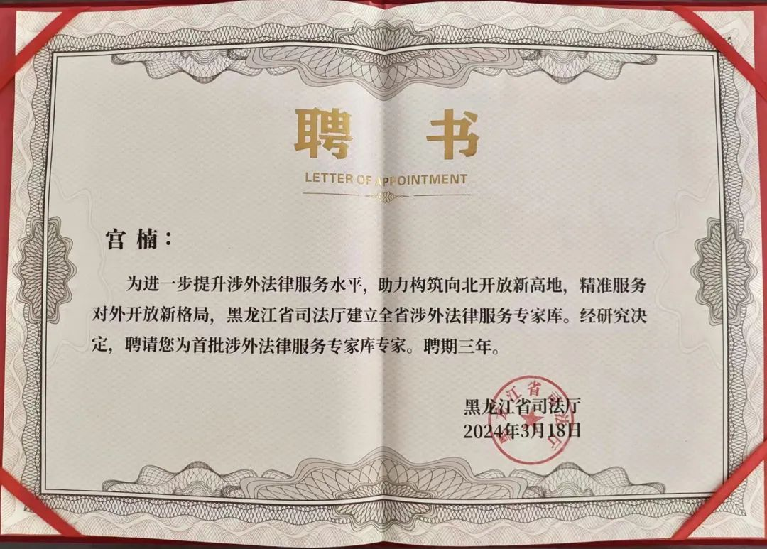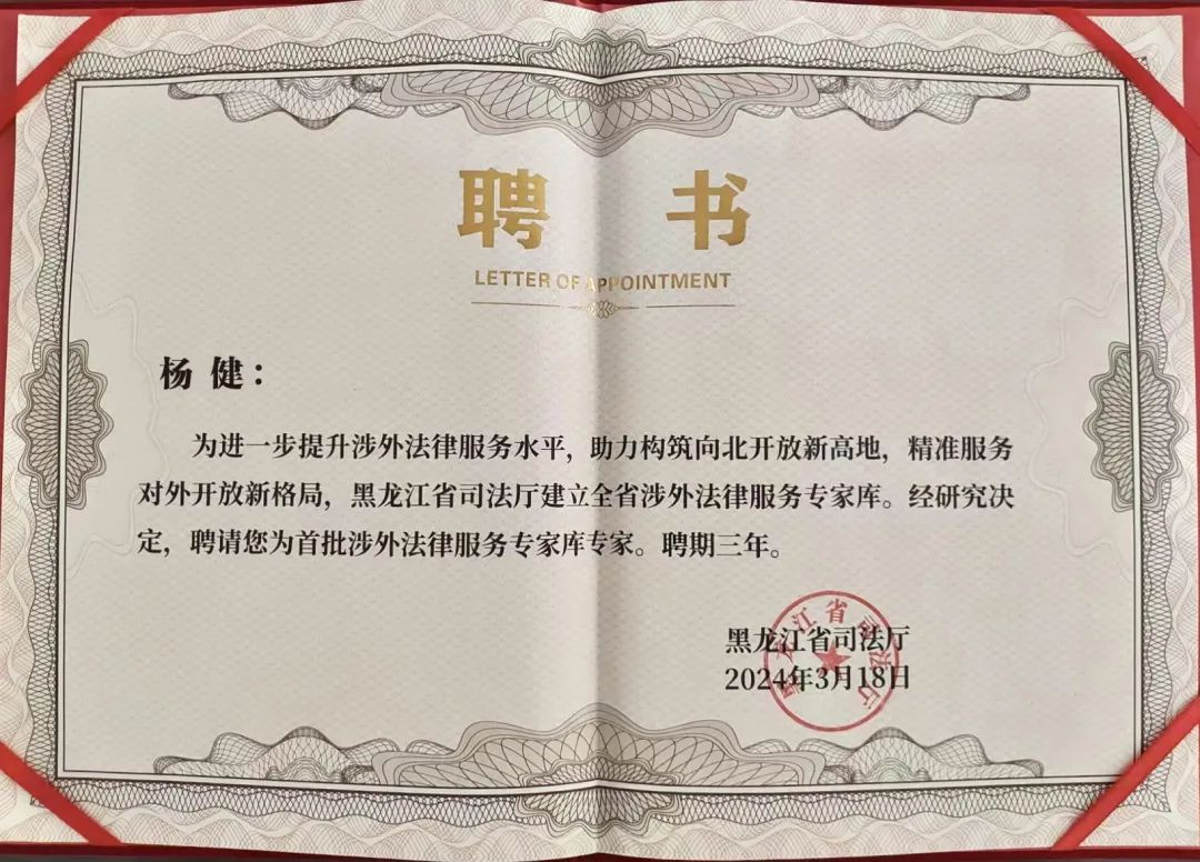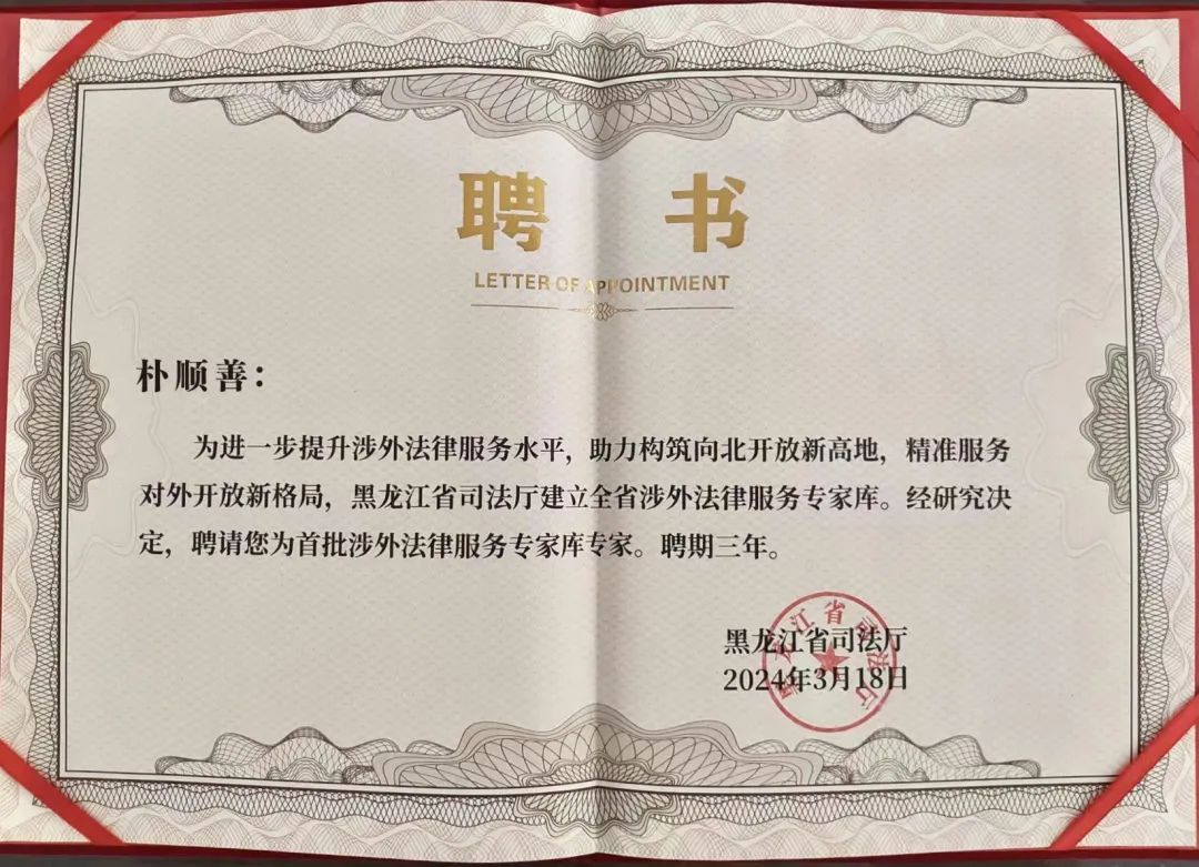 教师杨健、王佳慧、朴顺善、宫楠入选黑龙江省首批涉外法律服务专家库。首批涉外法律服务专家均为硕士以上学历,其中博士学历占30%,常年在省直机关、科研院所、高校及法律服务机构从事涉外法律实务和教学工作。