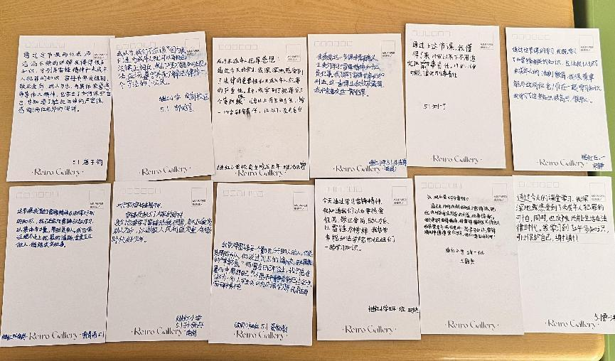 最后,同学们将感受写在明信片上。在明信片中,同学们深刻表达了对志愿者的感谢,深刻了解了雷锋精神,将雷锋精神传递下去。同时弥补了他们的法律盲区坚定了他们内心的法律底线,培养了同学们对于法律的兴趣,坚定了他们积极向上的心。