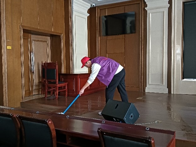 3月6日下午,志愿者们带着清洁工具来到模拟法庭进行清扫。擦桌椅,清垃圾,拖地板,大家不怕脏不怕累,不放过每一个死角,将模拟法庭打扫得干净整洁,焕然一新。模拟法庭的打扫任务结束后,志愿者们提着垃圾袋,在b区篮球场将裸露的生活垃圾、枯枝残叶等尽数拾起。在志愿者们的协同配合、分片推进下,篮球场的环境整洁了不少。