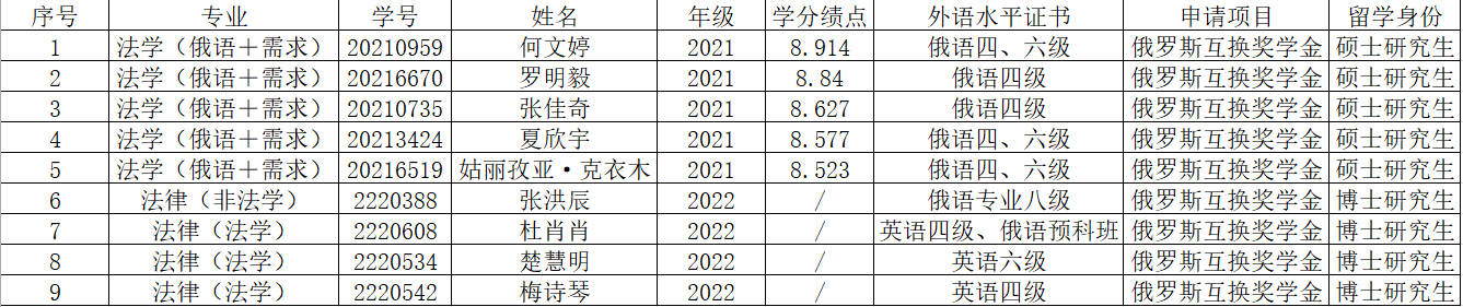 按照《2025/2026年度俄罗斯互换奖学金(中俄政府奖学金)项目遴选工作的通知》要求,根据项目具体介绍以及申请条件要求,经学生自愿申请,学院审核,拟推荐亚洲色情 以下9名学生申报此项目。现将推荐结果公示如下,公示期为2024年11月5日-7日。对推荐名单若有异议请联系杜老师,0451-86604892。