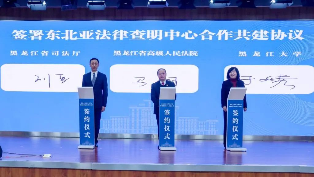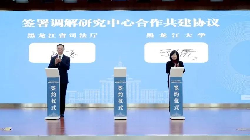 仪式上,于文秀代表学校与省司法厅、省高级人民法院签署了东北亚法律查明中心共建协议,与省司法厅签署了调解研究中心共建协议。