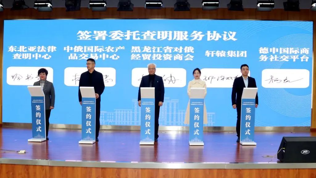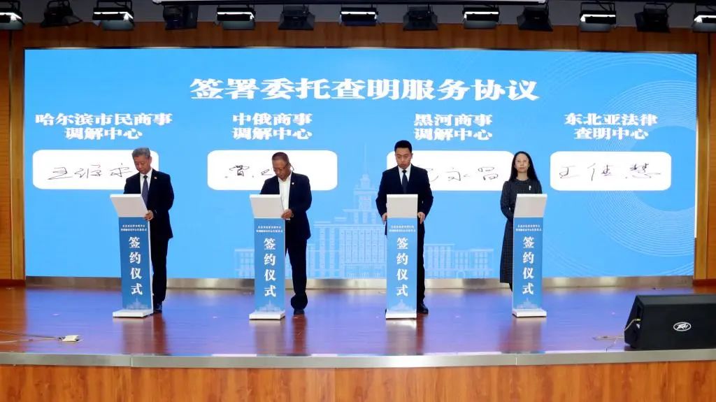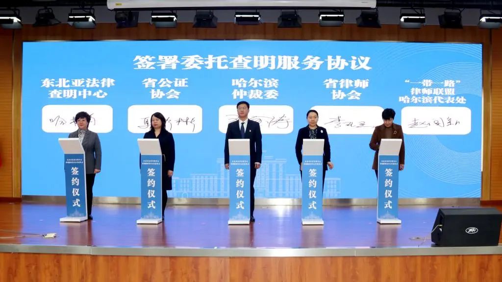 哈书菊与东北亚法律查明中心常务副主任王佳慧分别与省国资委、省公安厅、省外事办、省工商联、哈尔滨仲裁委员会、省律师协会、省公证协会、“一带一路”律师联盟哈尔滨代表处、省对俄经贸投资商会、轩辕集团、中俄国际农产品交易中心、德申国际商务社交平台以及商事调解联盟签署了委托服务协议。