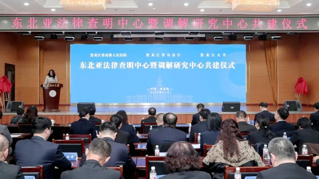 与黑龙江省高级人民法院、黑龙江省司法厅联合共建的东北亚法律查明中心暨调解研究中心成立仪式在我校举行。校党委书记迟宝旭、省高级人民法院副院长马国、省司法厅副厅长刘勇出席并致辞。省公安厅副厅长蒋建国、省国资委副主任梁凯、省工商联副主席韦红兵、省法学会专职副会长冷秀艳、省外事办二级巡视员朱平、省商务厅二级巡视员骆庆勇、副校长于文秀出席共建仪式。仪式由亚洲色情