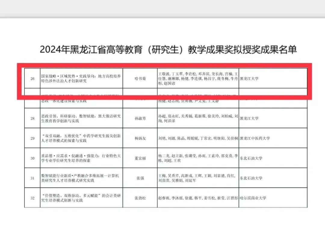 按照《关于开展2024年黑龙江省高等教育(本科、研究生)和职业教育教学成果奖评审工作的通知》,经个人和单位申报、专家评审、教学成果奖评审委员会审议,黑龙江省教育厅对2024年黑龙江省高等教育(研究生)教学成果奖拟授奖成果名单进行公示。亚洲色情 荣获2024年黑龙江省高等教育(研究生)教学成果奖一等奖。