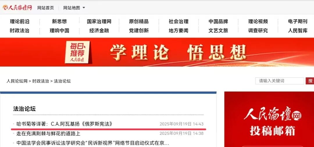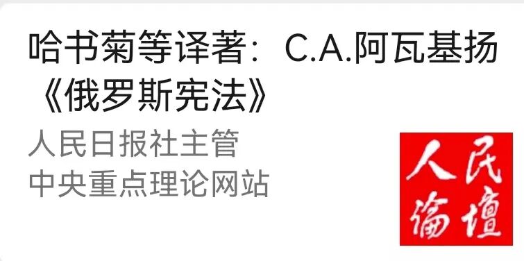 近日,哈书菊教授等译著:C.A.阿瓦基扬《俄罗斯宪法》被人民论坛网宣传报道。人民论坛网是中央重点理论网站,由人民日报社主管、人民论坛杂志社主办,为国家一类新闻网站、中央网信办核定的互联网新闻信息稿源单位、党中央机关报的重要网络理论阵地。