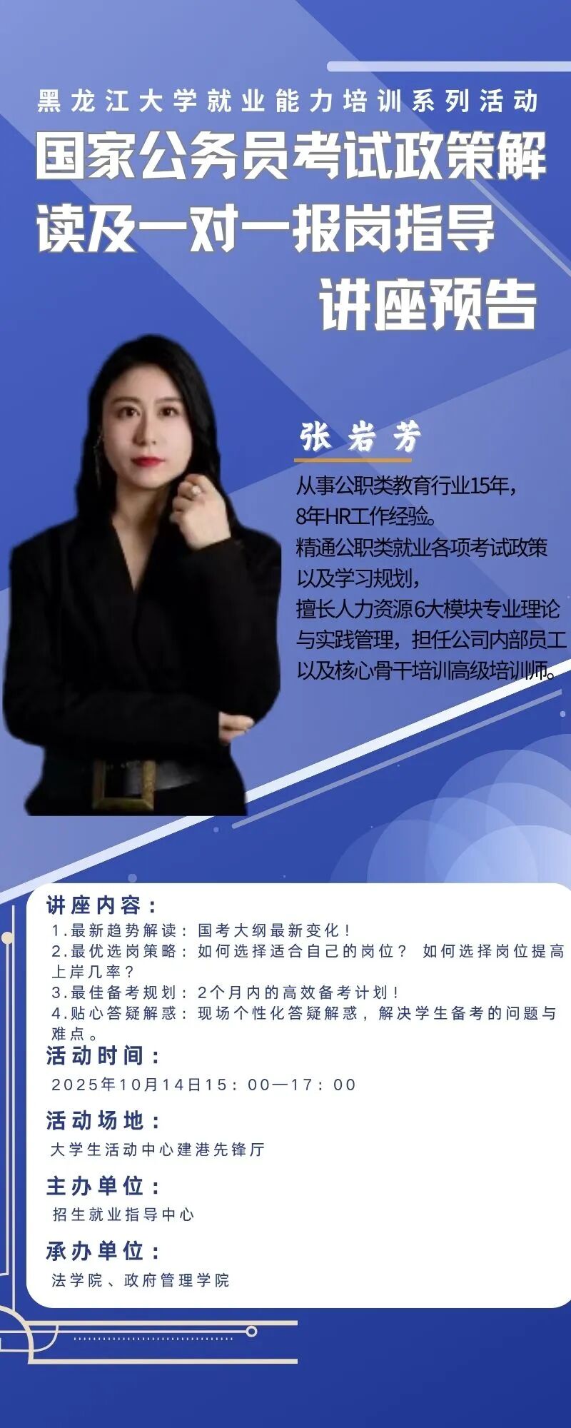 10月14日国家公务员考试公告即将发布,为帮助同学们精准对标岗位要求,科学规划备考方案,提高毕业生就业成功率和满意度,学校特启动就业能力培训系列活动,本期主题为“公务员考试政策解读及一对一报岗指导”,具体内容如下: