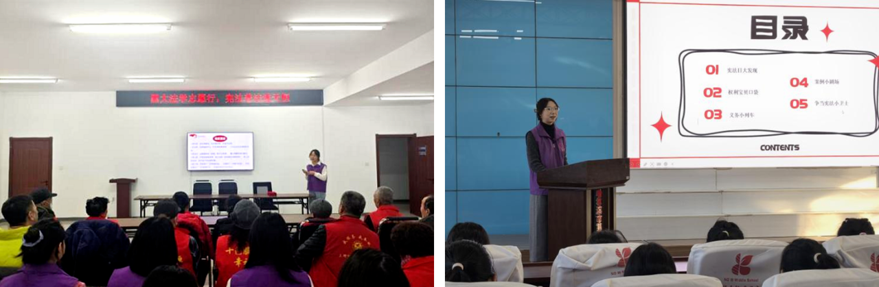 青年志愿者走进社区、校园等,发挥专业所学,开展宪法宣讲志愿服务活动。通过发放普法宣传单、讲解案例、现场互动等形式,增强社区居民和学生的权利义务意识和法治观念,帮助他们认识到宪法就在身边,将法律条文转化为生活指南,推动宪法从“纸上”走向“心中”。